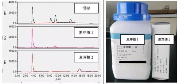 難道是色譜柱的原因?色譜柱柱效下降導致兩者不能分離?于是更換新的色譜柱再次分離,結(jié)果還是沒有能夠?qū)烧叻蛛x。如果葡萄糖和麥芽糖無法分離,實驗便無法進行下去,在經(jīng)過上述嘗試之后將問題的矛頭指向了所用的試劑。查試劑臺賬,發(fā)現(xiàn)實驗室里還有其他品牌分析純的葡萄糖,而麥芽糖僅此一瓶,但是幸運的是發(fā)現(xiàn)了葡萄糖和麥芽糖的標準品,決定使用麥芽糖和葡萄糖的標準品試一下。