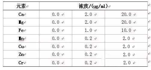 用1.0mg/mL 的Ca、Mg、Fe、Cu、Zn、Mn、Cr元素的標(biāo)準(zhǔn)溶液,逐級稀釋,配制混合標(biāo)準(zhǔn)溶液。