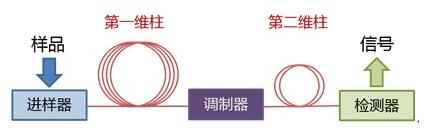 全二維氣相色譜(comprehensive two-dimensional GC, GC×GC)是在傳統(tǒng)的一維氣相色譜上發(fā)展起來的一種新的色譜分析技術。其主要原理是把分離機理不同而又互相獨立的兩支色譜柱以串聯(lián)方式連接,中間裝有一個調制器(modulator), 經第一根柱子分離后的所有餾出物在調制器內進行濃縮聚集后以周期性的脈沖形式釋放到第二根柱子里進行繼續(xù)分離,最后進入色譜檢測器。這樣在第一維沒有完全分開的組分(共餾出物)在第二維進行進一步分離,達到了正交分離的效果。