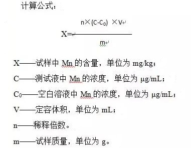 將樣品放在馬弗爐550℃±15℃溫度下灰化,分解有機質后,加鹽酸使灰分中的無機離子全部溶解,然后導入原子吸收分光光度計的空氣-乙炔火焰中原子化,測定錳元素的吸光度,并與錳元素校正溶液的吸光度比較定量。