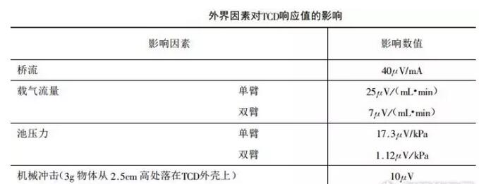 從表中可以看出熱絲溫度對靈敏度影響最大,溫度改變1℃靈敏度變化竟達(dá)12400μV。除了要求橋流穩(wěn)定外,檢測器溫度的波動也嚴(yán)重影響絲溫。所以TCD靈敏度越高,要求檢測器的溫度控制精度也越高。一般均應(yīng)小于±0.01℃。如果出現(xiàn)基線緩慢來回擺動,一周期約幾分鐘,即可能與溫控精度不夠有關(guān)。